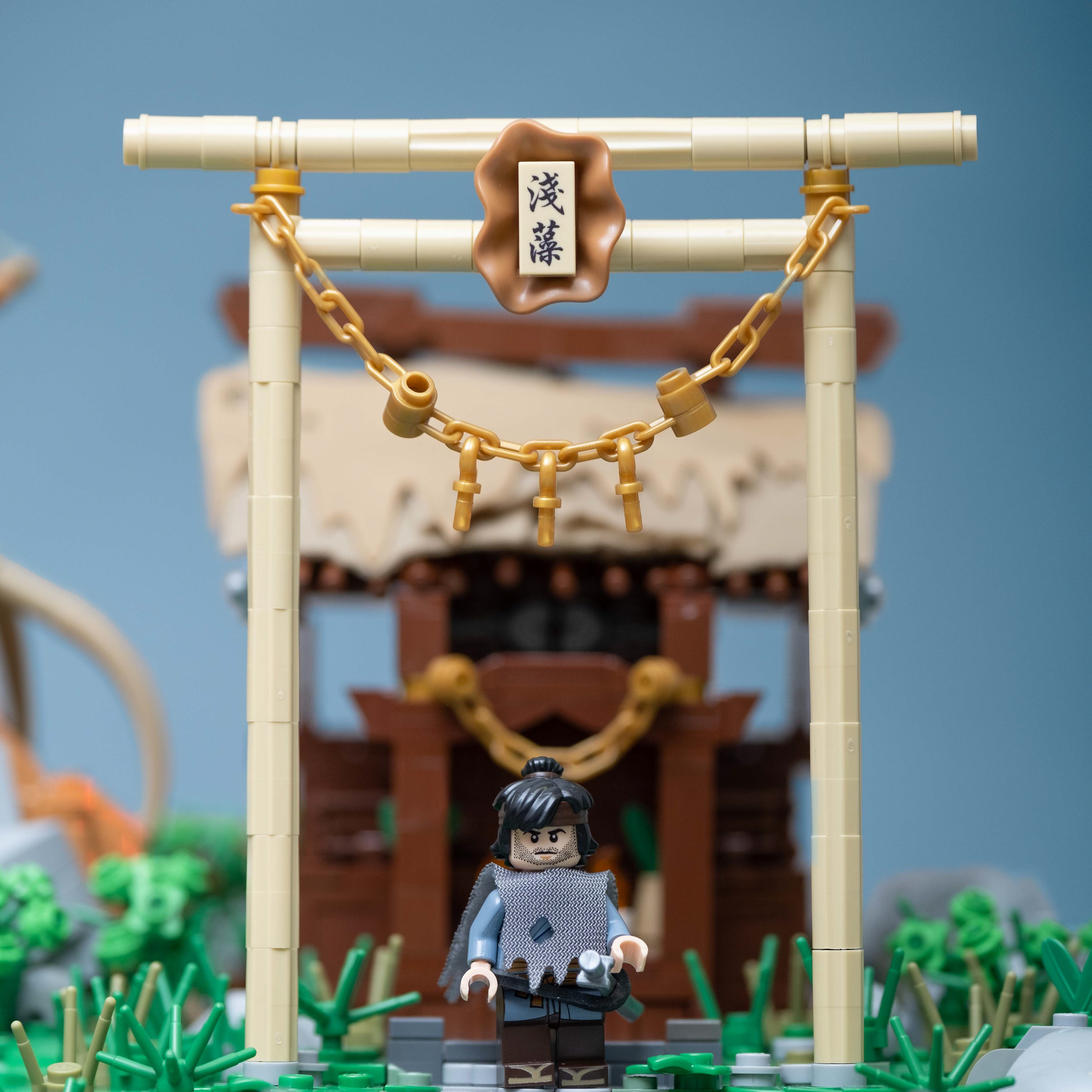 The shrine I chose is named the Arrow Peak Shrine and is probably the first one many players stumble across. It is located in the region of Izuhara (厳原) the first part of Tsushima that can be explored. Izuhara is divided into seven prefectures. In the game, each of these prefectures has exactly one shintō shrine. The Arrow Peak Shrine can be found in the middle of Azamo (淺藻), the southern most prefecture. For that reason, the name Azamo is also written on the sign of the torii (鳥居), the wooden archway in front of the shrine. To recreate it, I had the Kanji printed on a tan (Colour-ID 2) LEGO® tile and used a Minifigure skirt (Part-ID 24782pb05) as a frame.