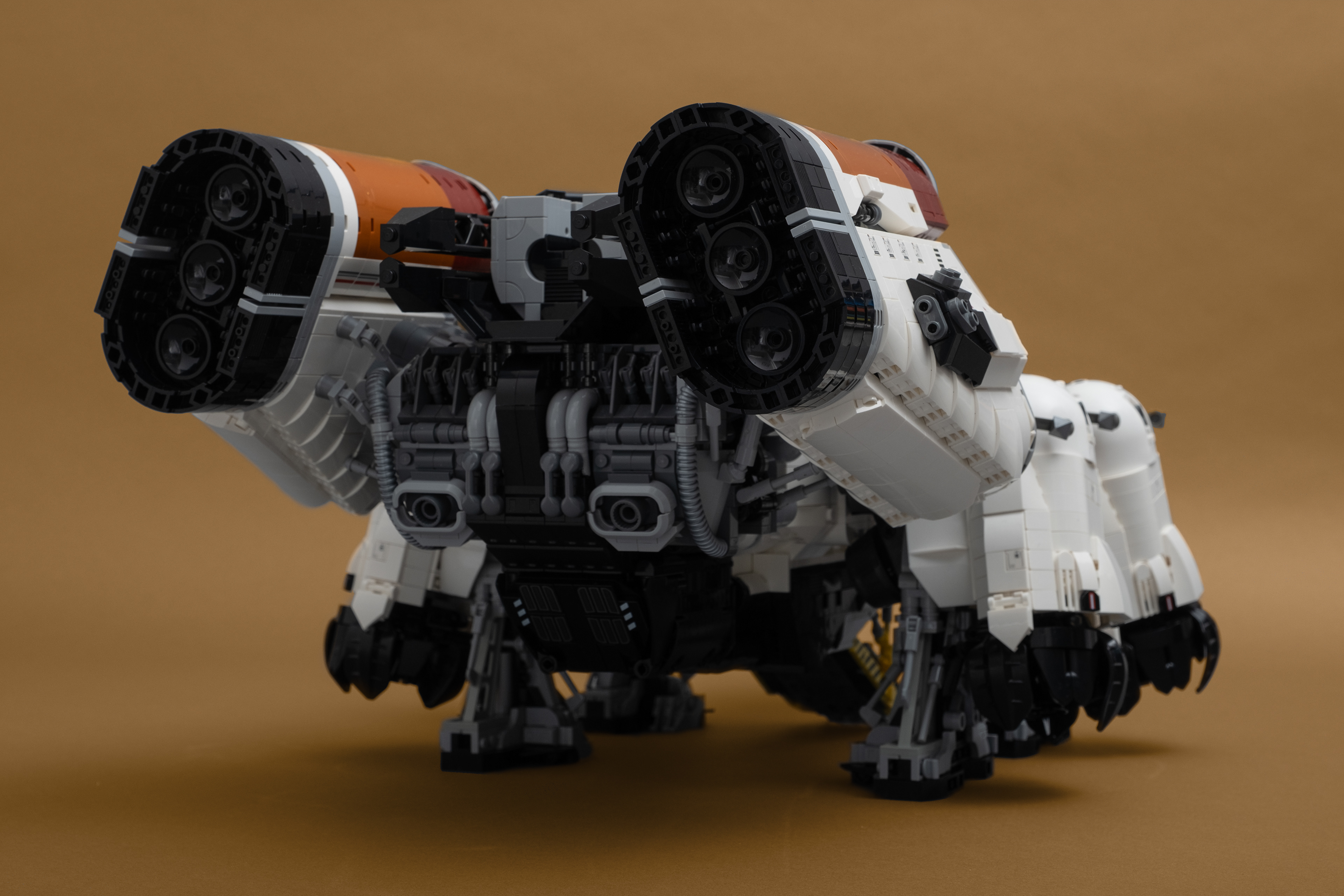 When I started designing the Frontier, Starfield had not come out yet. I therefore took the Starfield Direct - Gameplay Deep Dive as my main source of inspiration. That video already shows the ship customiser as well as the official measurements of the Frontier which I used to recreate the ship close to Minifigure-scale. The finished model is 66cm long and 40cm wide which is slightly bigger than a 1:32 recreation should be. It consists of roughly 9000 LEGO® pieces, making it one of the larger models I designed.