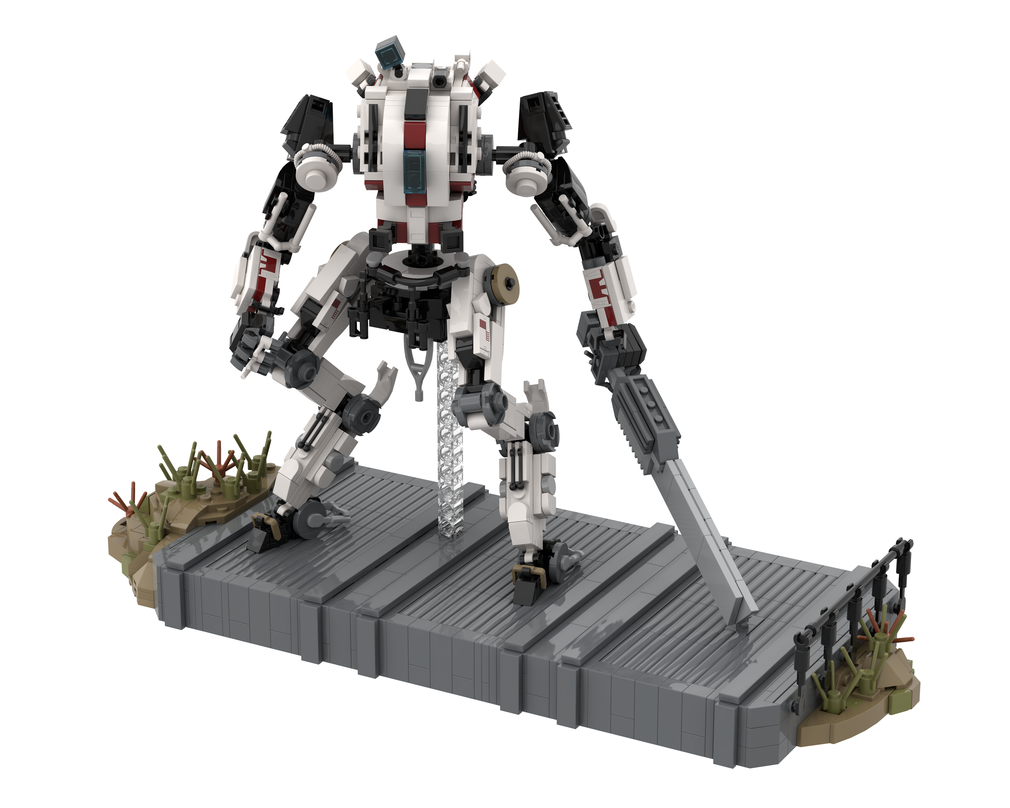 This bundle includes the instructions as well as the list of parts for a LEGO® Model inspired by the Ronin-Class Titan from the 2016 game "Titanfall 2" as well as a small base for it to stand on.