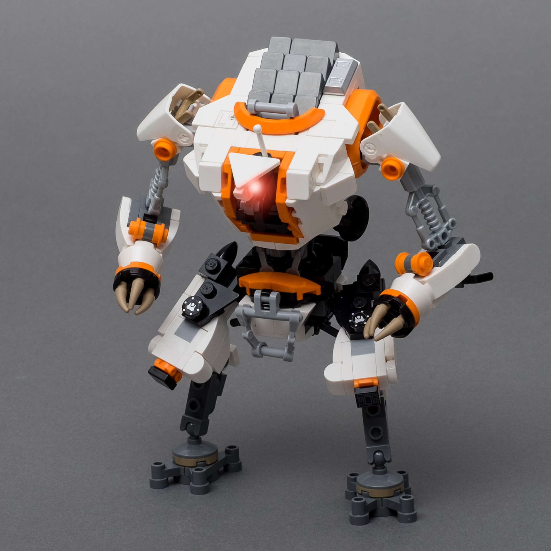 There are bright light orange (Colour-ID 110) accents throughout the design of the Titan. On the cockpit, the shoulders, the forearms and the rear, these were made with actual LEGO®. On the right knee as well as on the heels the accents were created using custom decals. Meanwhile, the black stripe on the cockpit is completely brick build.
