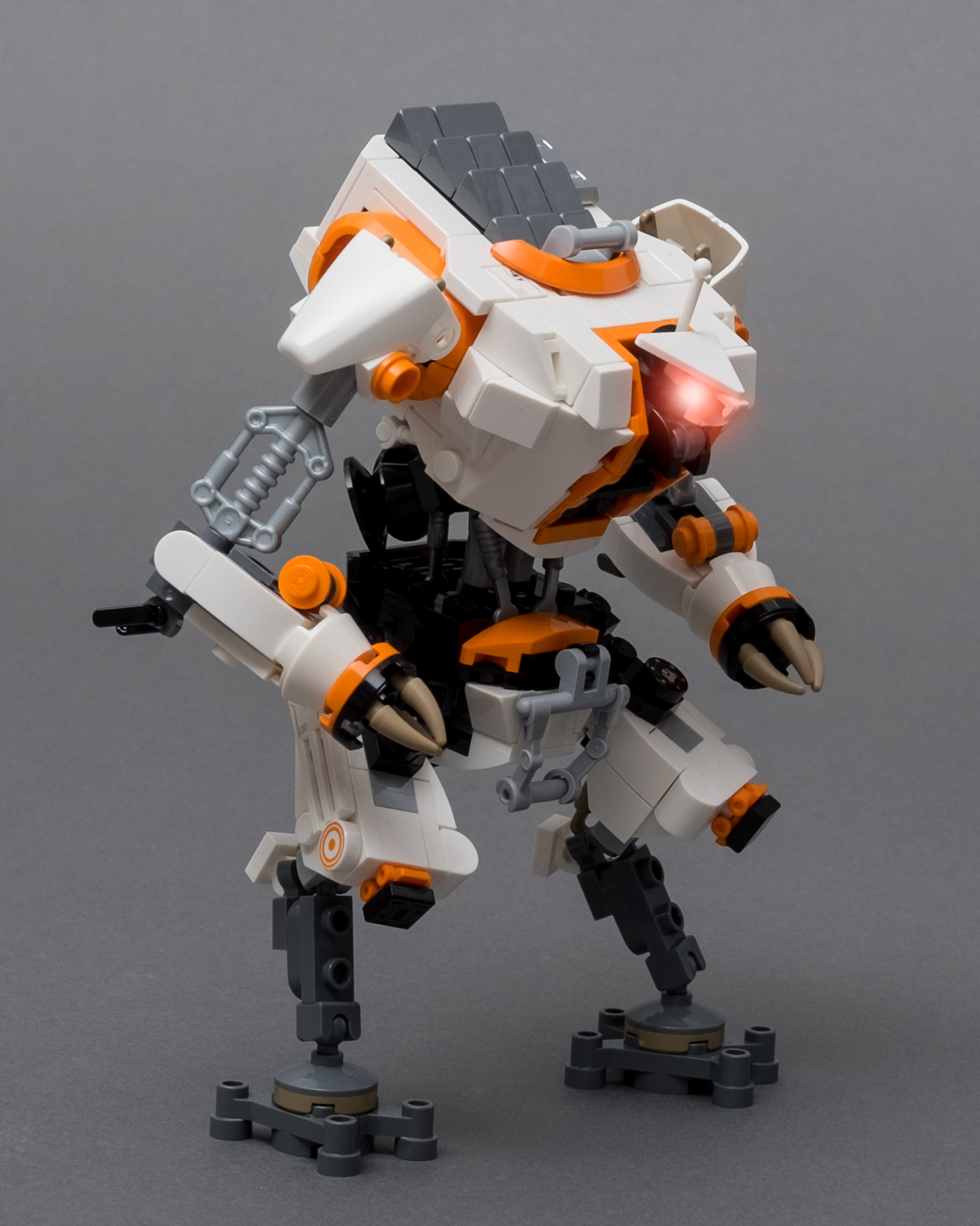 For building the Reaper with LEGO® to make sense, it had to be in the same scale as the Titans. This demanded some creative solutions to maintain both the form of the original as well as the livery. The colour splits of white (Colour-ID 1) and orange (4) are primarily achieved by using LEGO® wheel arches (Part-ID 28326) on the side and top of the torso. A white road sign (Part-ID 892) is used for the shape of the head and old head-pieces (Part-ID x209) from the LEGO® "Slizer" product line are used for the shoulders. Minifigure weapons (Part-ID 55237g) compose his upper arms and the addition of multiple bucket-handles add the necessary texture.