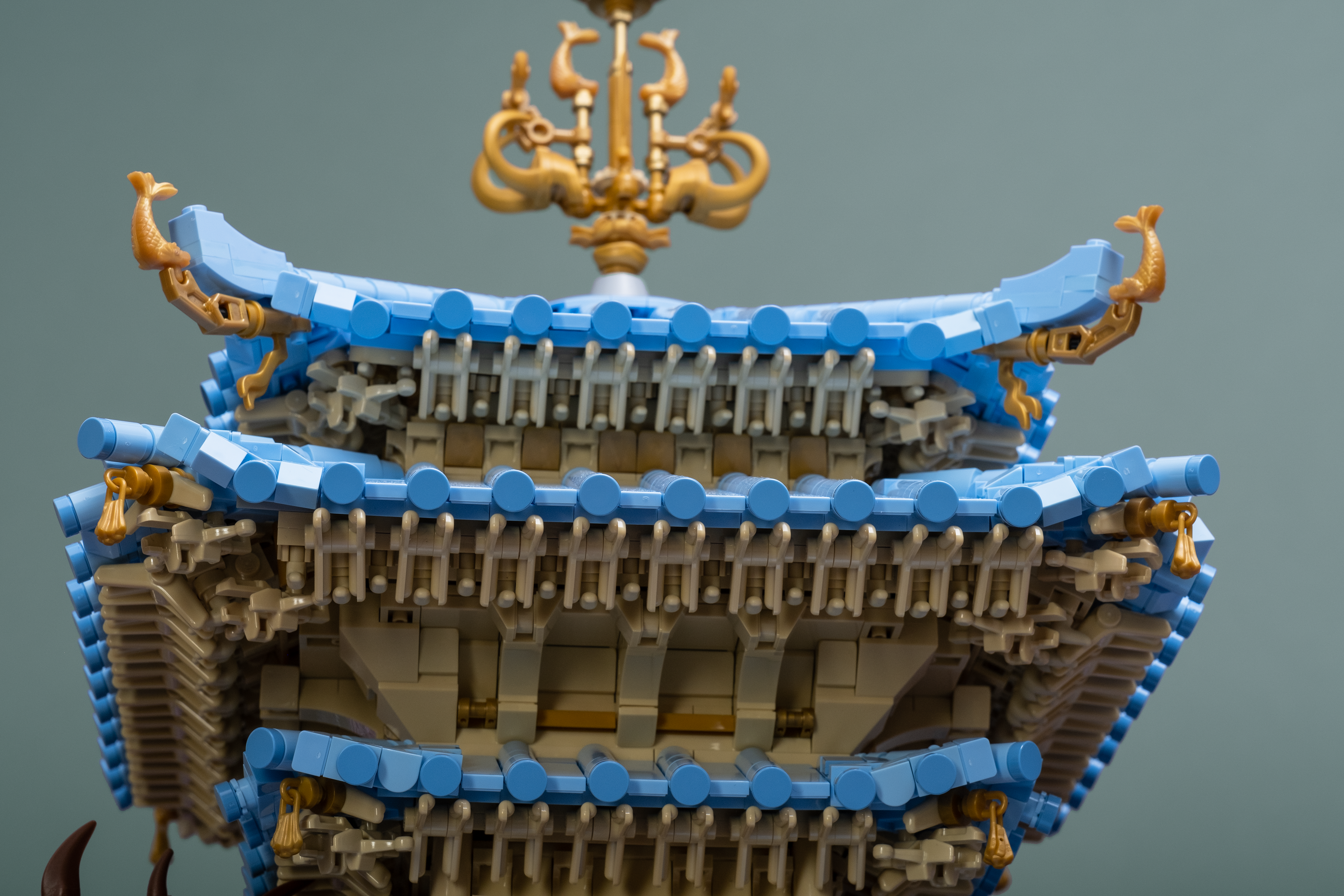 Most of the tree's design was achieved through trial and error. There were many different ideas that I toyed around with. At one point I wanted the tree to have a full "Ƨ"-shape, but that would have made the tower too tall, so I settled on more of a "?"-shape instead. I also thought about having the tree break through the pagoda at two points instead of just at the top. But doing so would have meant that the curvature of the tree would be quite flat, so I decided to wrap it around the back of the building instead. As for the bark of the tree, I used the same approach as I did with the bonsai and used a mix of LEGO® Technic and LEGO® System parts in reddish brown (Colour-ID 88). There is also a variety of claws (Part-ID 87747 and 11089), horns (Part-ID 13564 and 40379), tails (Part-ID 24204 and 67361), and vines (Part-ID 55236) used all over the tree. In the beginning, I thought each branch of the tree should have leaves, but I realised that that would distract too much from the dragon shape. Therefore, I intentionally shaped some of the branches into limbs and hands. I am particularly happy with the design of the two arms closest to the head, as they appear to wrap around the pagoda's roof.