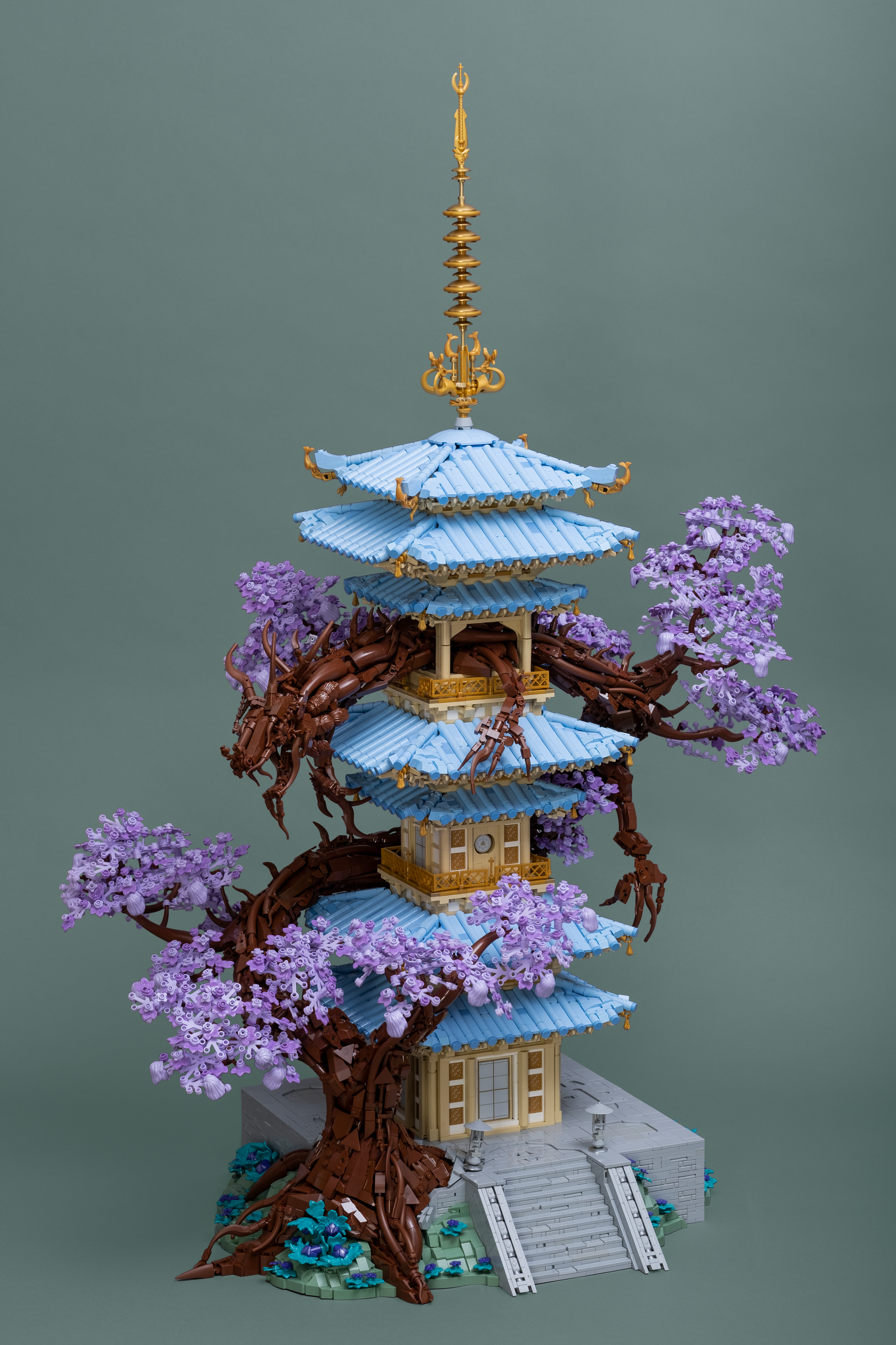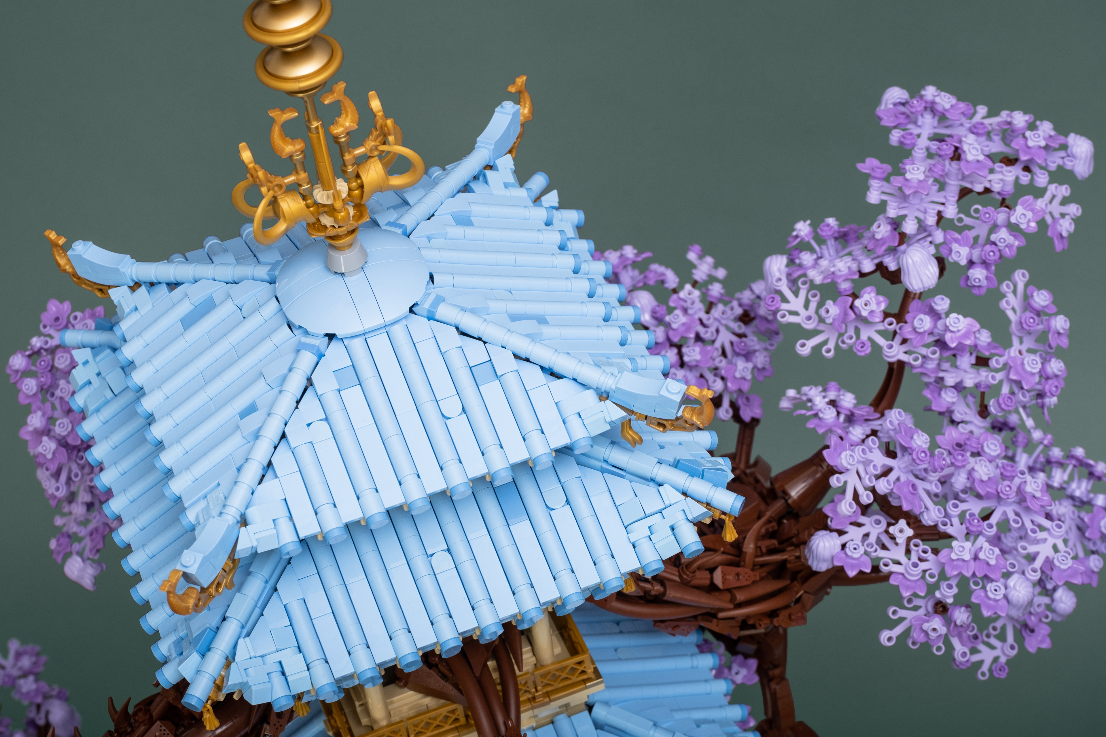 But humans are fallible. So I wondered: What would happen if men dedicated a shrine to the wrong kami? Would the local kami be enraged? Would nature itself turn against the blasphemous construction? These questions fuelled the storyline that I envisioned for the model: The local spirit creates a tree which bursts out of the ground and wraps itself around the temple. The shape of the tree was inspired by the aforementioned Kiyohime, as were the colours: Originally I planned for the leaves to be dark blue (Colour-ID 63), as a nod to her transformation in the river, but after finishing the pagoda and most of the tree, I decided on lavender (Colour-ID 154) and medium lavender (Colour-ID 157) leaves instead. These colours are the transition between red and blue, the two tones Kiyohime's clothes are often presented in. Lavender also worked better with the bright light blue (Colour-ID 105) of the pagoda's roof and made the tree look brighter and more fantastical. In addition, the colour change allowed for a larger variety of pieces to be used as leaves, such as flower parts (Part-ID 32607) and LEGO® Minifigure hair pieces (Part-ID 85974).