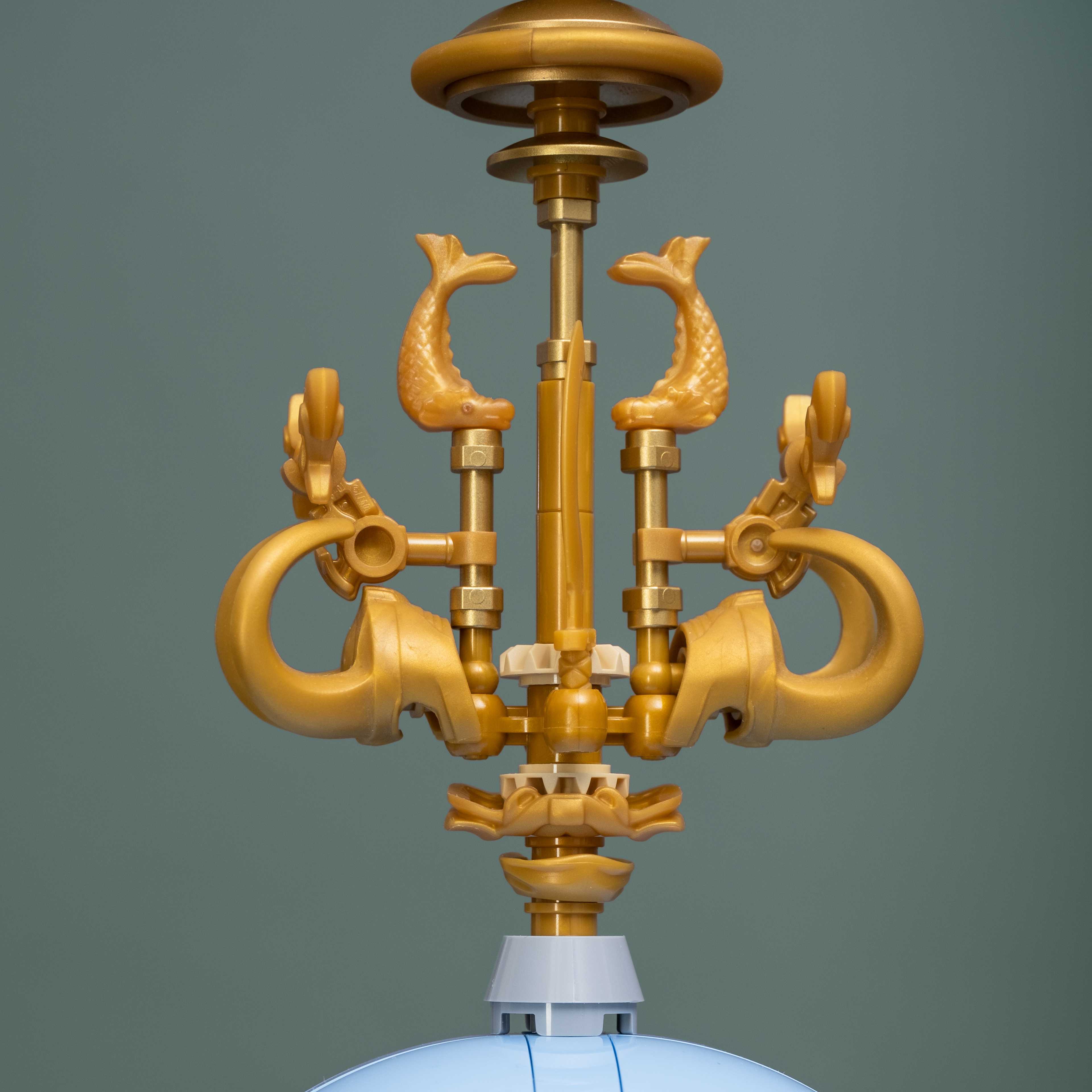 Whenever I am free to design without a clear, singular inspiration, I try to make the work more self-referential. For instance, the pagoda has three stories as does the modern Dōjōji. The sōrin, the spear-like structure at the top of the tower, has many horn-shaped pieces (Part-ID 86125e and 10909) at its base, imitating the claws of the dragon. Above that, it has five large golden rings (Part-ID 2815), mimicking the five main roofs of the tower itself. In between, there are seven smaller golden dishes (Part-ID 4740), referencing the seven roofs in total. The number five comes up in other places as well. The stone railing next to the stairs, for example, has five hammers (Part-ID 75904) incorporated on each side. The word for five in Japanese is 五 [go] and is phonetically identical to a prefix-honorific. At shrines it is common to donate five Yen, as its name ごえん [goen] can also stand for a 'good connection'. It is therefore a number with a positive and important association.
