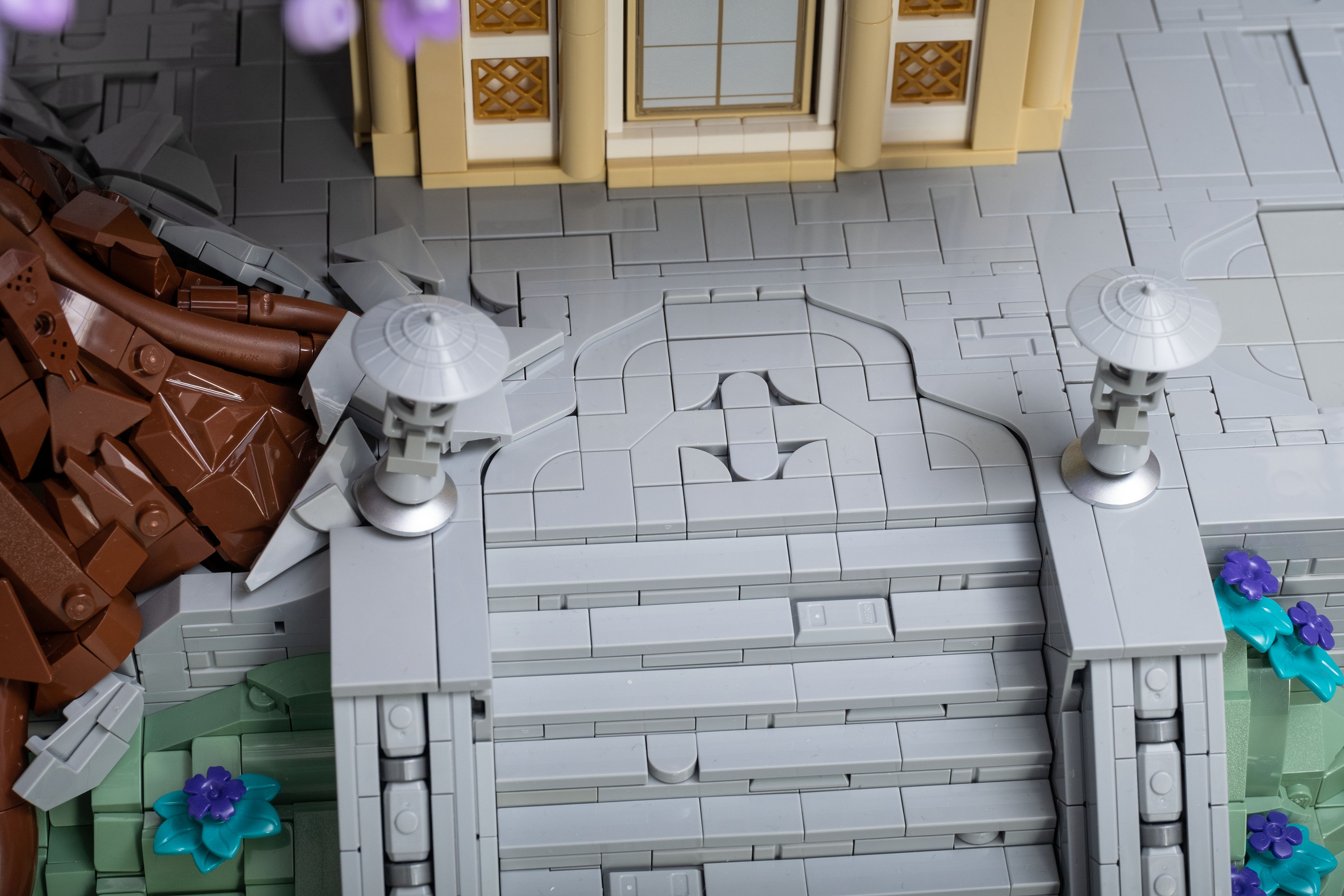 In comparison to the decorative tower, I intended the base to be more uncluttered. It therefore lacks any fencing or statues and is kept entirely in light bluish grey (Colour-ID 86). Still, it needed to look like a realistic stone pedestal, which was achieved by making it appear more deteriorated through the usage of ingots (Part-ID 99563), cobbled bricks (Part-ID 98283) and parts in light grey (Colour-ID 9). To avoid the platform looking too plain, I added floor patterns which are recessed by half a plate. These are particularly noticeable in front of the stairs where they taper in circular shapes towards the entrance of the tower.