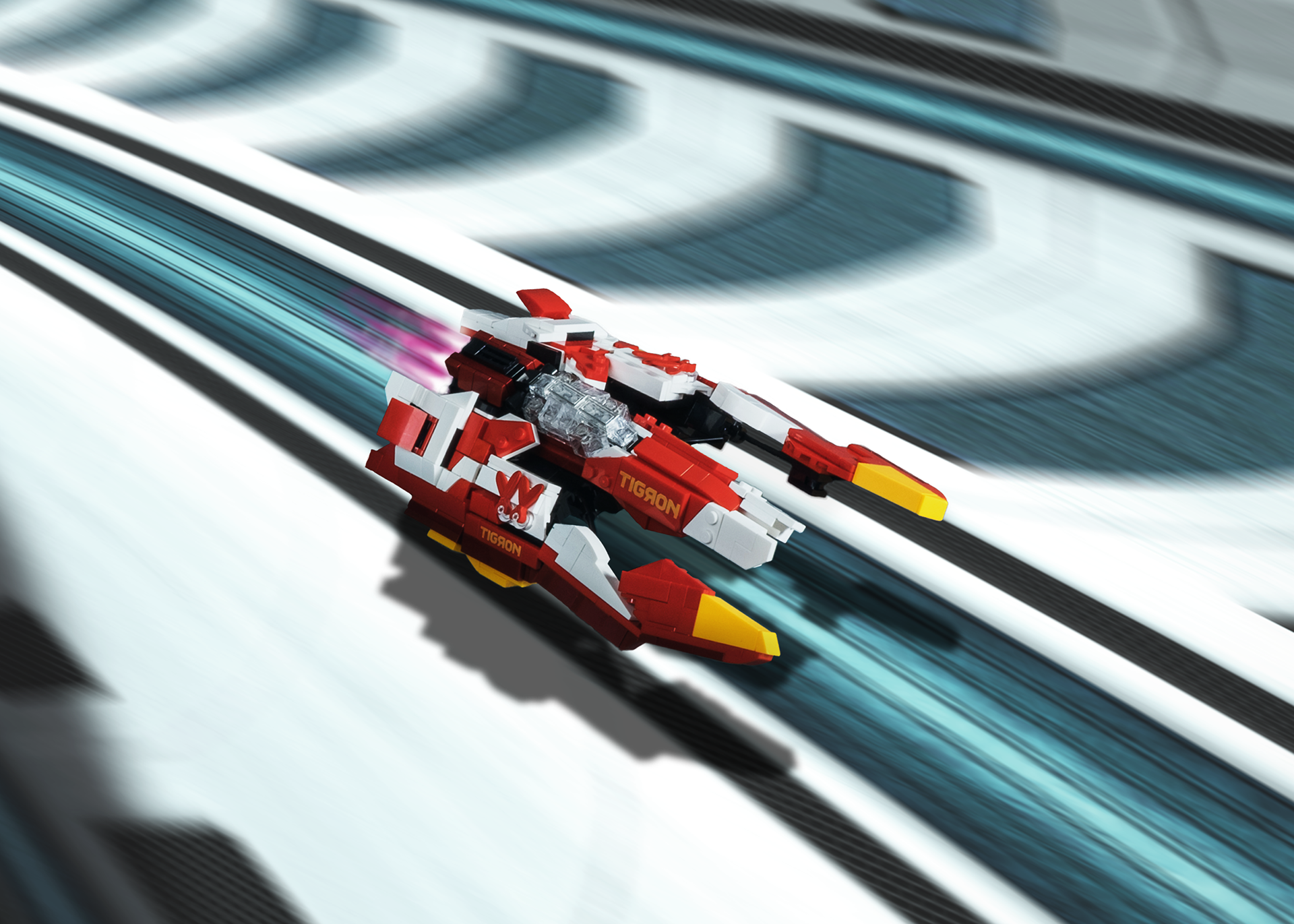 The Tigron was also the easiest to build in LEGO® and the first of the three ships I created. The angular panels as well as the straight color splits render it perfect for this medium. Its color palette of red, dark-red, white and yellow also allows for the use of a great variety of pieces. The aggressively shaped forward arms as well as the prominent livery make the Tigron K-VSR one of my favourite racers and the most fun to put together.